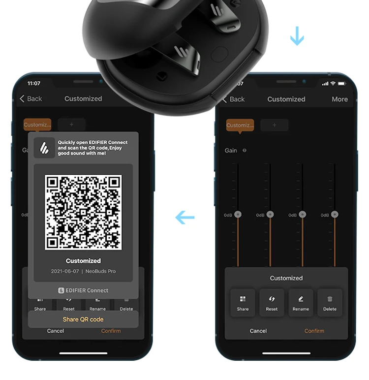 There are 3 EQ modes that can be selected---Dynamic, Pure and Customized, which can be switched freely through the App. The user can also personalize the tones with EQ to get the exclusive sound effect. EQ settings can be shared with your friends.